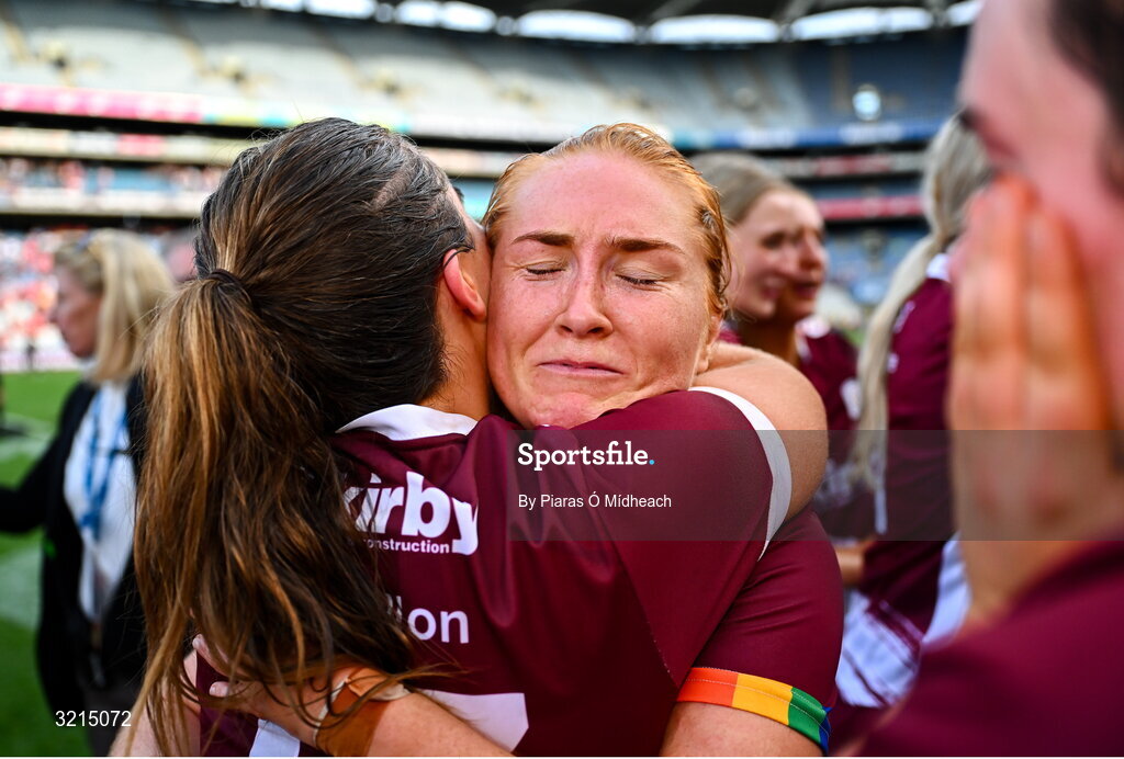 10 August 2025; Galway players Roisin Black, right, and Mairead Dillion celebrate after the Glen Dimplex All-Ireland Senior Camogie Championship final match between Cork and Galway at Croke Park in Dublin. Photo by Piaras Ó Mídheach/Sportsfile