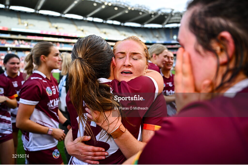 10 August 2025; Galway players Roisin Black and Mairead Dillion, 13, celebrate after the Glen Dimplex All-Ireland Senior Camogie Championship final match between Cork and Galway at Croke Park in Dublin. Photo by Piaras Ó Mídheach/Sportsfile