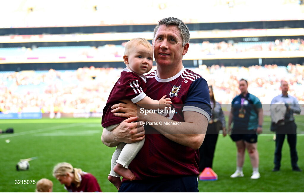 10 August 2025; Galway manager Cathal Murray with his son Aodhán after victory in the Glen Dimplex All-Ireland Senior Camogie Championship final match between Cork and Galway at Croke Park in Dublin. Photo by Piaras Ó Mídheach/Sportsfile