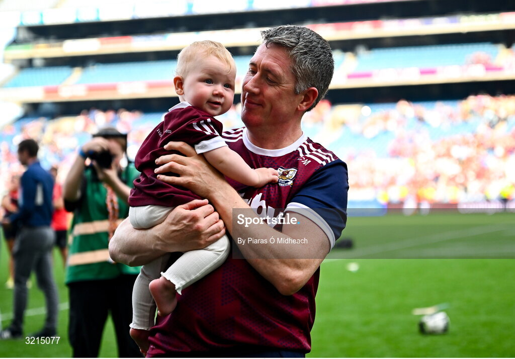 10 August 2025; Galway manager Cathal Murray with his son Aodhán after victory in the Glen Dimplex All-Ireland Senior Camogie Championship final match between Cork and Galway at Croke Park in Dublin. Photo by Piaras Ó Mídheach/Sportsfile