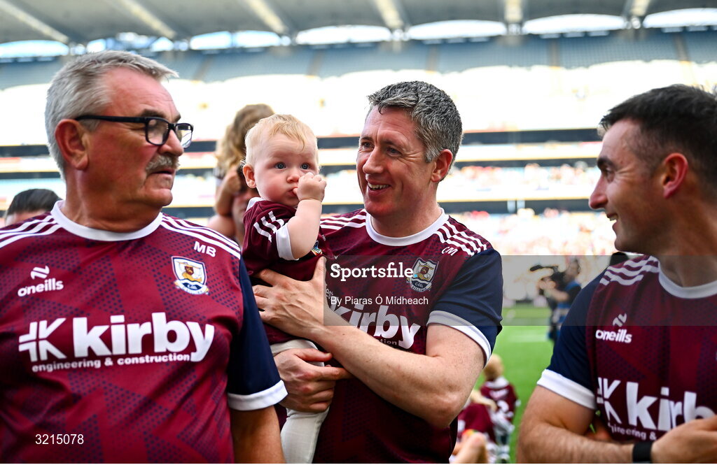 10 August 2025; Galway manager Cathal Murray with his son Aodhán after victory in the Glen Dimplex All-Ireland Senior Camogie Championship final match between Cork and Galway at Croke Park in Dublin. Photo by Piaras Ó Mídheach/Sportsfile