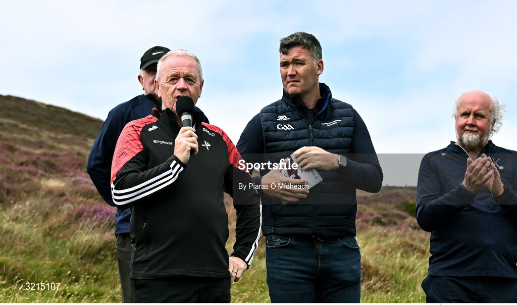 4 August 2025; Louth county board chairman Sean McClean makes a speech after the M. Donnelly GAA Poc Fada All-Ireland Finals at Annaverna Mountain in the Cooley Peninsula, Ravensdale, Louth. Photo by Piaras Ó Mídheach/Sportsfile