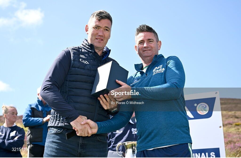 4 August 2025; GAA National Head of Hurling Willie Maher, left, makes a presentation to Pat Burke of Westmeath after the M. Donnelly GAA Poc Fada All-Ireland Finals at Annaverna Mountain in the Cooley Peninsula, Ravensdale, Louth. Photo by Piaras Ó Mídheach/Sportsfile