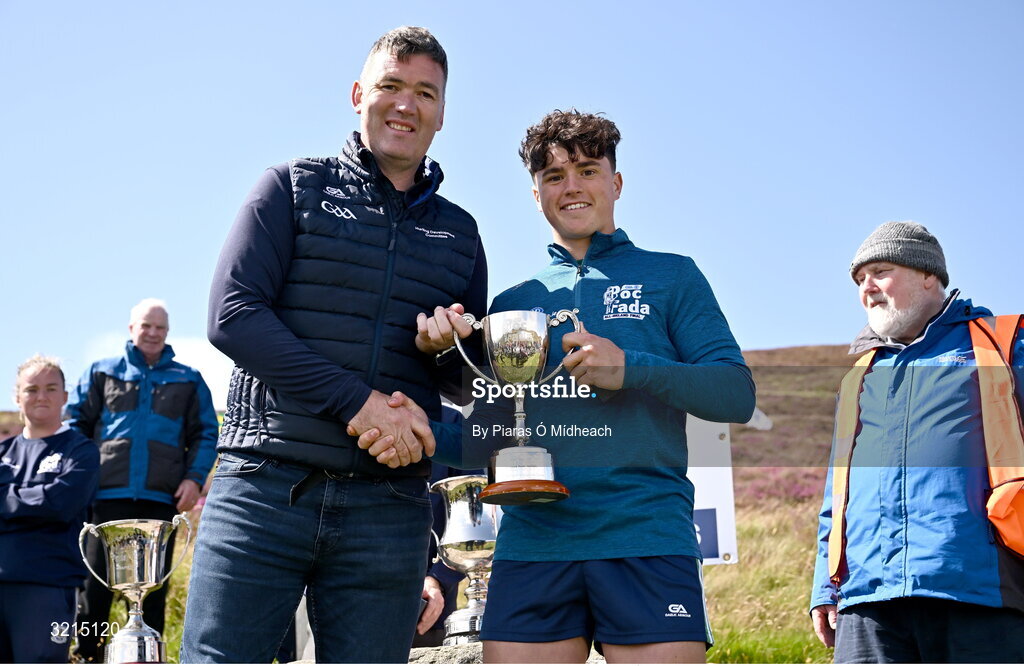 4 August 2025; GAA National Head of Hurling Willie Maher, left, makes a presentation to Hurling Under 16 winner Conor Raleigh of Westmeath after the M. Donnelly GAA Poc Fada All-Ireland Finals at Annaverna Mountain in the Cooley Peninsula, Ravensdale, Louth. Photo by Piaras Ó Mídheach/Sportsfile