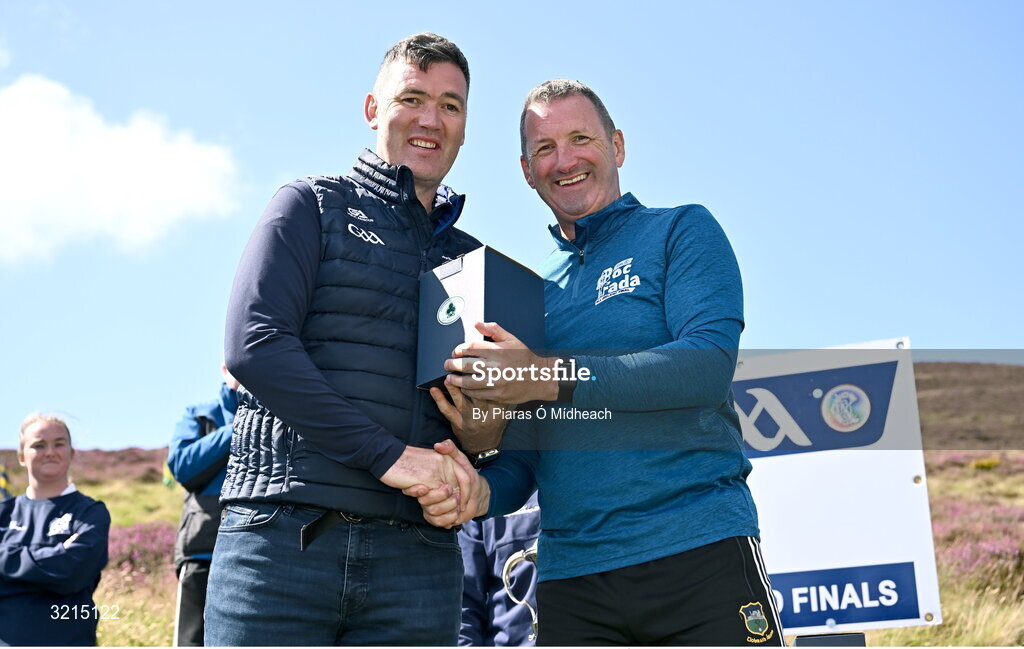 4 August 2025; GAA National Head of Hurling Willie Maher, left, makes a presentation to Brendan Cummins of Tipperary after the M. Donnelly GAA Poc Fada All-Ireland Finals at Annaverna Mountain in the Cooley Peninsula, Ravensdale, Louth. Photo by Piaras Ó Mídheach/Sportsfile
