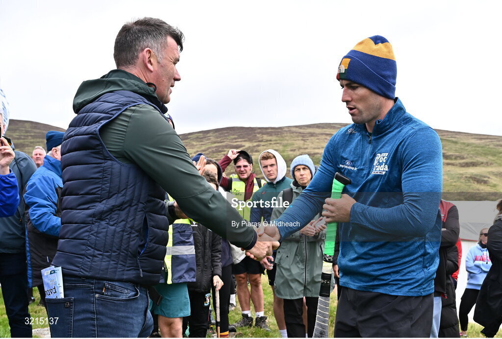 4 August 2025; GAA National Head of Hurling Willie Maher presents a sliotar to Fionan Mackessy of Kilkenny before the M. Donnelly GAA Poc Fada All-Ireland Finals at Annaverna Mountain in the Cooley Peninsula, Ravensdale, Louth. Photo by Piaras Ó Mídheach/Sportsfile