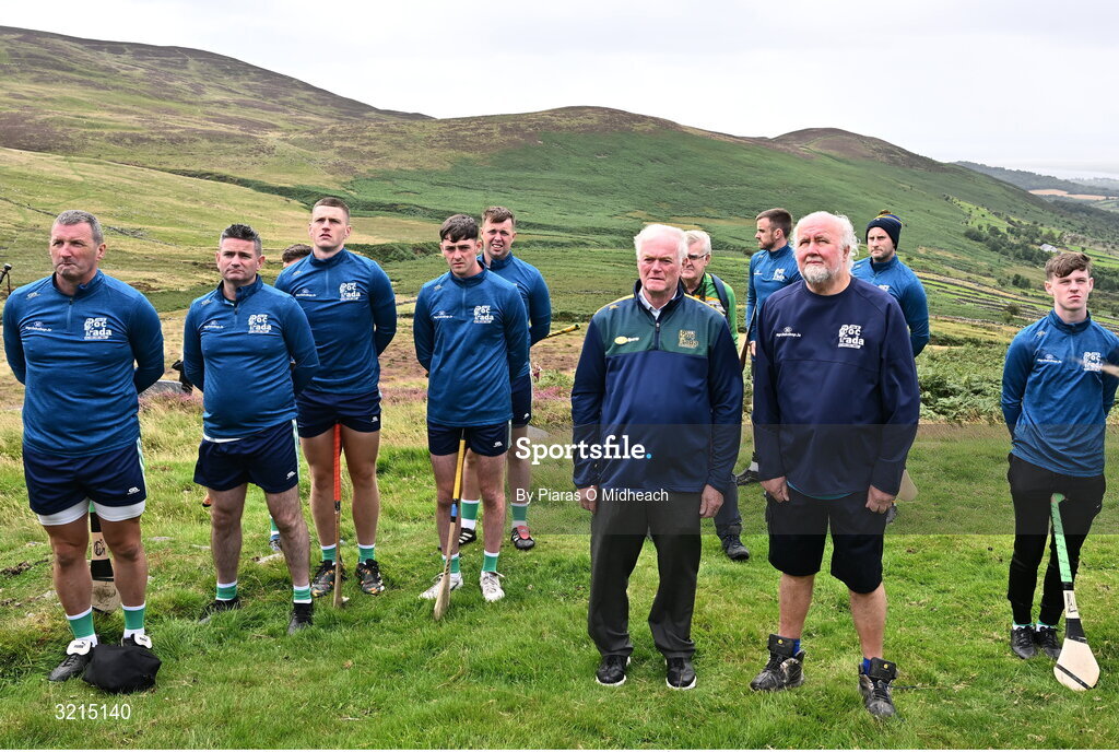 4 August 2025; National Poc Fada Committee Cathaoirleach Tom Ryan, front left, and event sponsor Martin Donnelly before the M. Donnelly GAA Poc Fada All-Ireland Finals at Annaverna Mountain in the Cooley Peninsula, Ravensdale, Louth. Photo by Piaras Ó Mídheach/Sportsfile