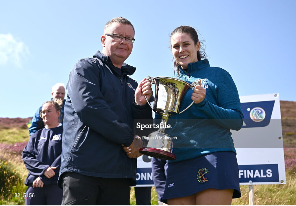 4 August 2025; Camogie President Brian Molloy makes a presentation to Senior Camogie winner Molly Lynch of Cork after the M. Donnelly GAA Poc Fada All-Ireland Finals at Annaverna Mountain in the Cooley Peninsula, Ravensdale, Louth. Photo by Piaras Ó Mídheach/Sportsfile