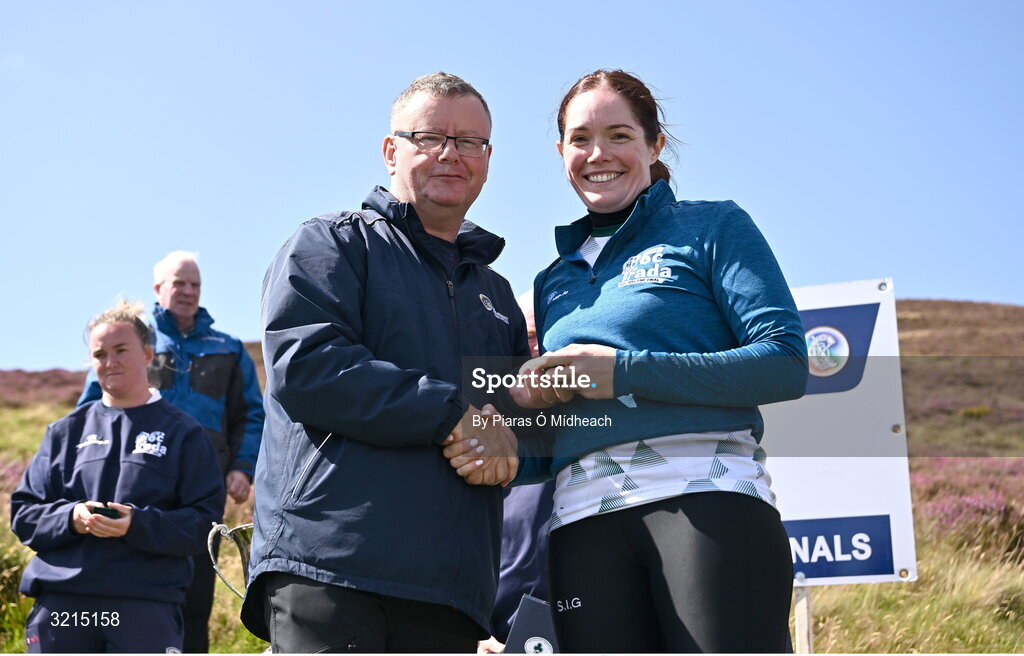 4 August 2025; Camogie President Brian Molloy makes a presentation to Sara-Louise Graffin of Down after the M. Donnelly GAA Poc Fada All-Ireland Finals at Annaverna Mountain in the Cooley Peninsula, Ravensdale, Louth. Photo by Piaras Ó Mídheach/Sportsfile