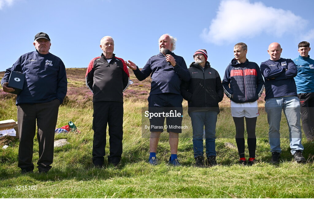 4 August 2025; Event sponsor Martin Donnelly makes a speech after the M. Donnelly GAA Poc Fada All-Ireland Finals at Annaverna Mountain in the Cooley Peninsula, Ravensdale, Louth. Photo by Piaras Ó Mídheach/Sportsfile