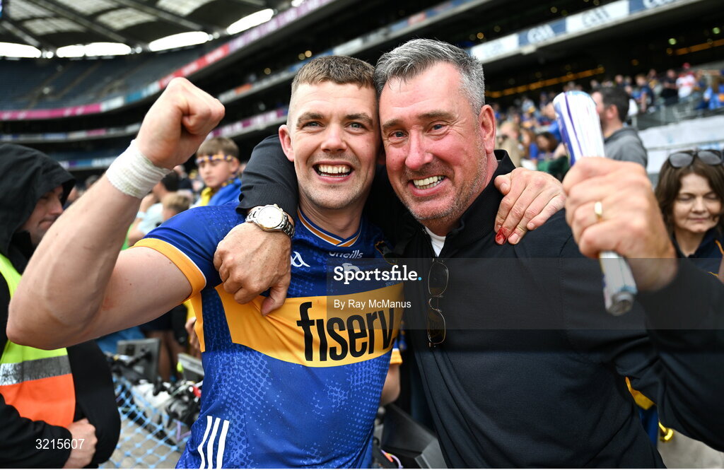 20 July 2025; Ronan Maher of Tipperary and Denis Walsh after the GAA Hurling All-Ireland Senior Championship final match between Cork and Tipperary at Croke Park in Dublin. Photo by Ray McManus/Sportsfile