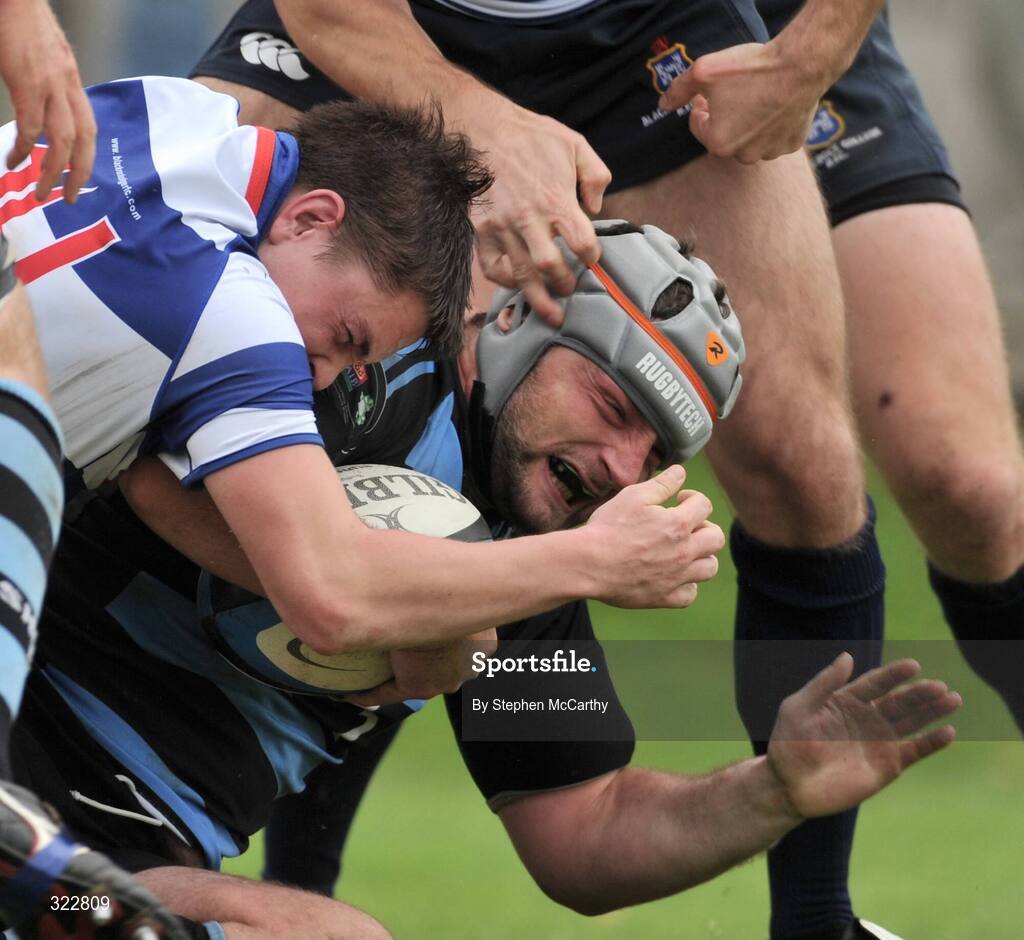 4 October 2008; David Quinlan, Shannon, is tackled by David Rowan, Blackrock. AIB League Division 1, Blackrock v Shannon, Stradbrook Road, Blackrock, Co. Dublin. Picture credit: Stephen McCarthy / SPORTSFILE