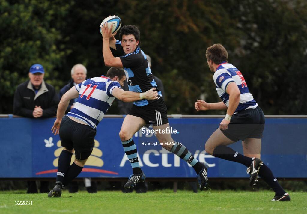 4 October 2008; John O'Connor, Shannon, is tackled by Shane Monahan, left, and Paul Ryan, Shannon. AIB League Division 1, Blackrock v Shannon, Stradbrook Road, Blackrock, Co. Dublin. Picture credit: Stephen McCarthy / SPORTSFILE