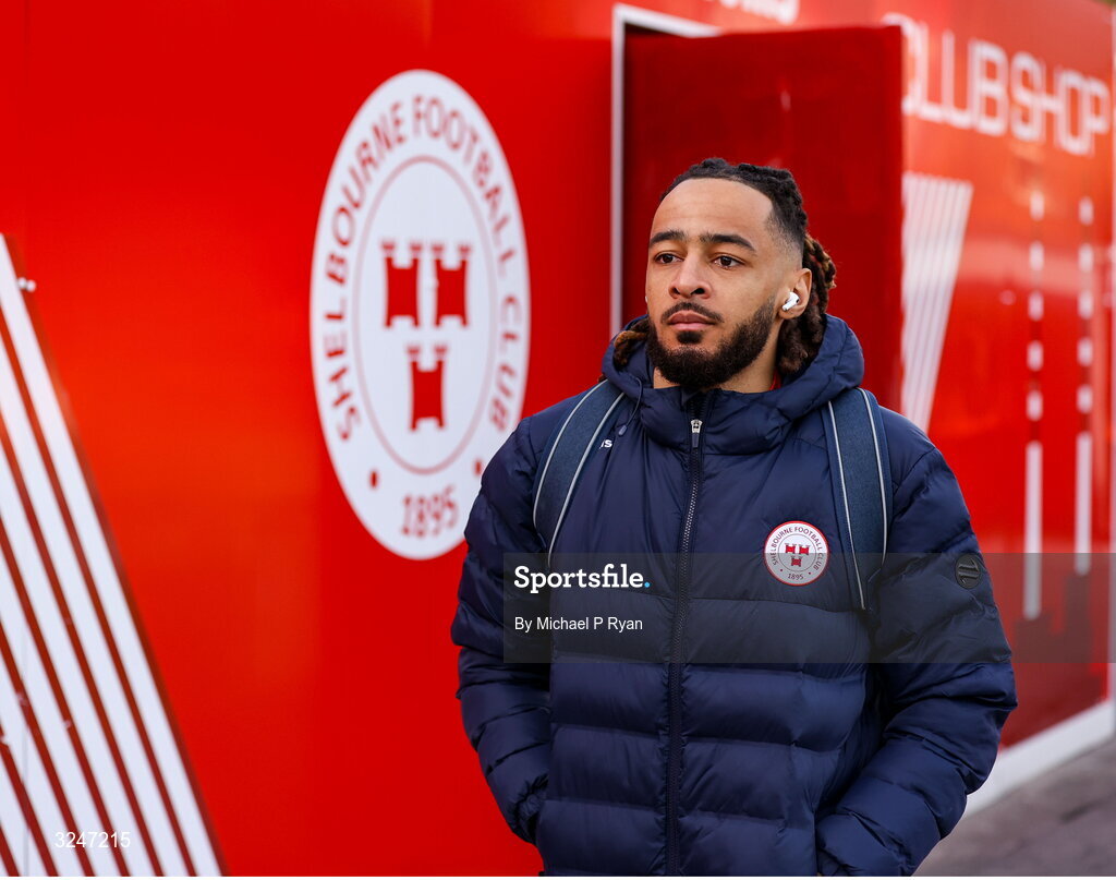 26 September 2025; Milan Mbeng of Shelbourne arrives before the SSE Airtricity Men's Premier Division match between Shelbourne and Waterford at Tolka Park in Dublin. Photo by Michael P Ryan/Sportsfile