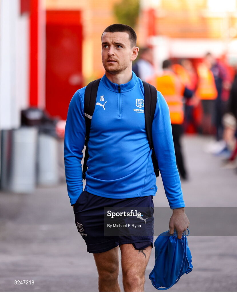 26 September 2025; Darragh Leahy of Waterford arrives before the SSE Airtricity Men's Premier Division match between Shelbourne and Waterford at Tolka Park in Dublin. Photo by Michael P Ryan/Sportsfile