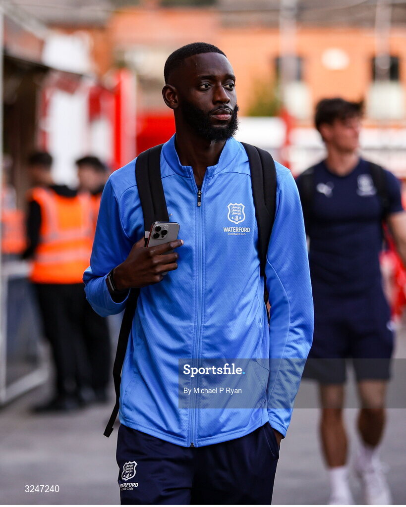 26 September 2025; Muhammadu Faal of Waterford arrives before the SSE Airtricity Men's Premier Division match between Shelbourne and Waterford at Tolka Park in Dublin. Photo by Michael P Ryan/Sportsfile