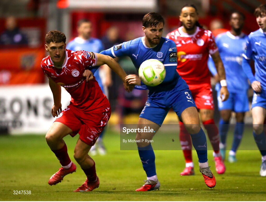 26 September 2025; John Martin of Shelbourne in action against Ryan Burke of Waterford during the SSE Airtricity Men's Premier Division match between Shelbourne and Waterford at Tolka Park in Dublin. Photo by Michael P Ryan/Sportsfile