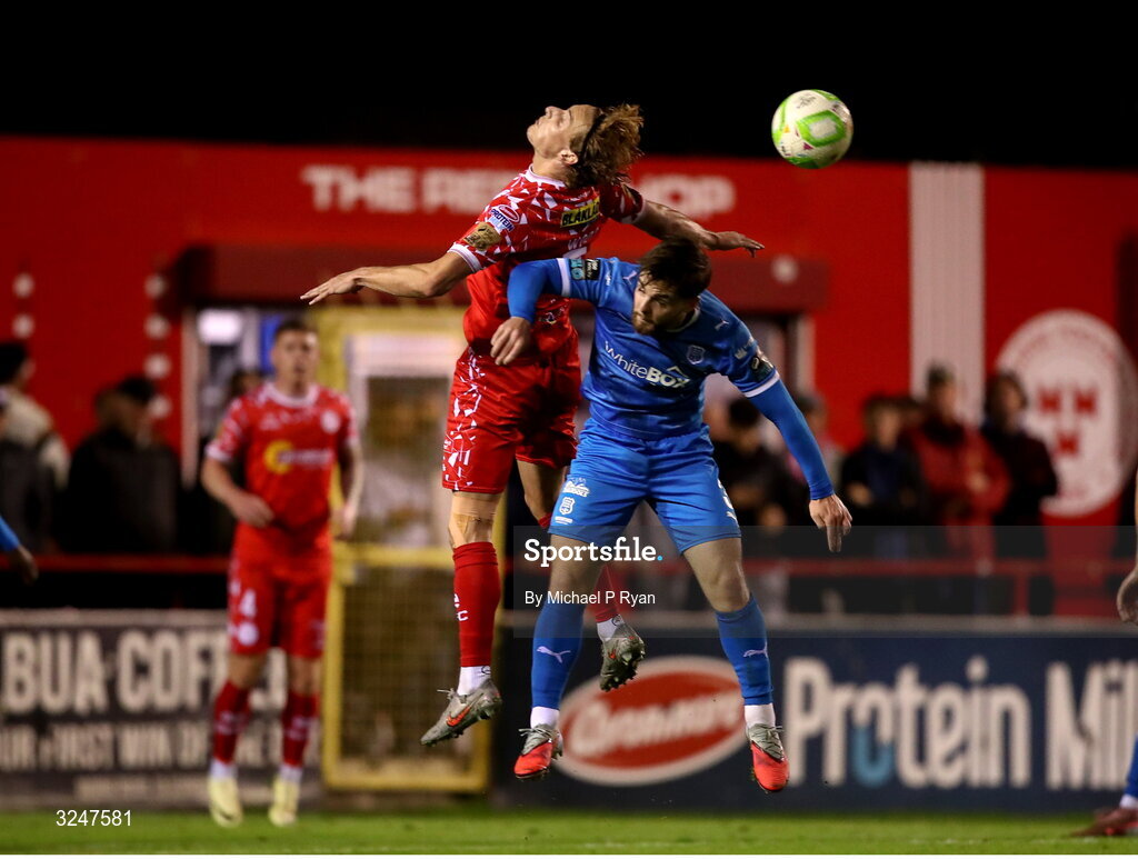26 September 2025; Harry Wood of Shelbourne in action against Ryan Burke of Waterford during the SSE Airtricity Men's Premier Division match between Shelbourne and Waterford at Tolka Park in Dublin. Photo by Michael P Ryan/Sportsfile