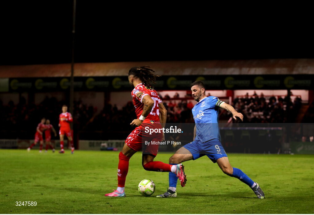 26 September 2025; Milan Mbeng of Shelbourne in action against Padraig Amond of Waterford during the SSE Airtricity Men's Premier Division match between Shelbourne and Waterford at Tolka Park in Dublin. Photo by Michael P Ryan/Sportsfile