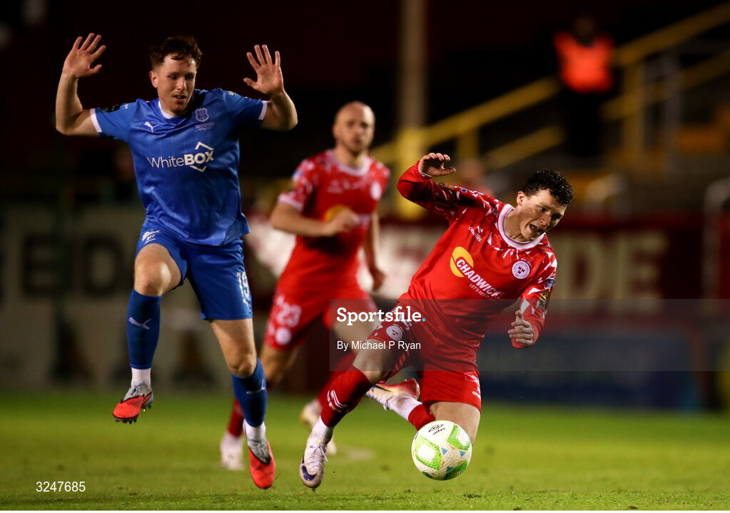 26 September 2025; Ali Coote of Shelbourne in action against Sam Glenfield of Waterford during the SSE Airtricity Men's Premier Division match between Shelbourne and Waterford at Tolka Park in Dublin. Photo by Michael P Ryan/Sportsfile