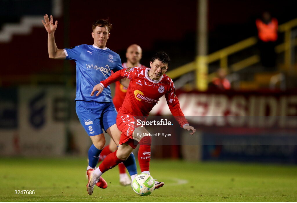 26 September 2025; Ali Coote of Shelbourne in action against Sam Glenfield of Waterford during the SSE Airtricity Men's Premier Division match between Shelbourne and Waterford at Tolka Park in Dublin. Photo by Michael P Ryan/Sportsfile