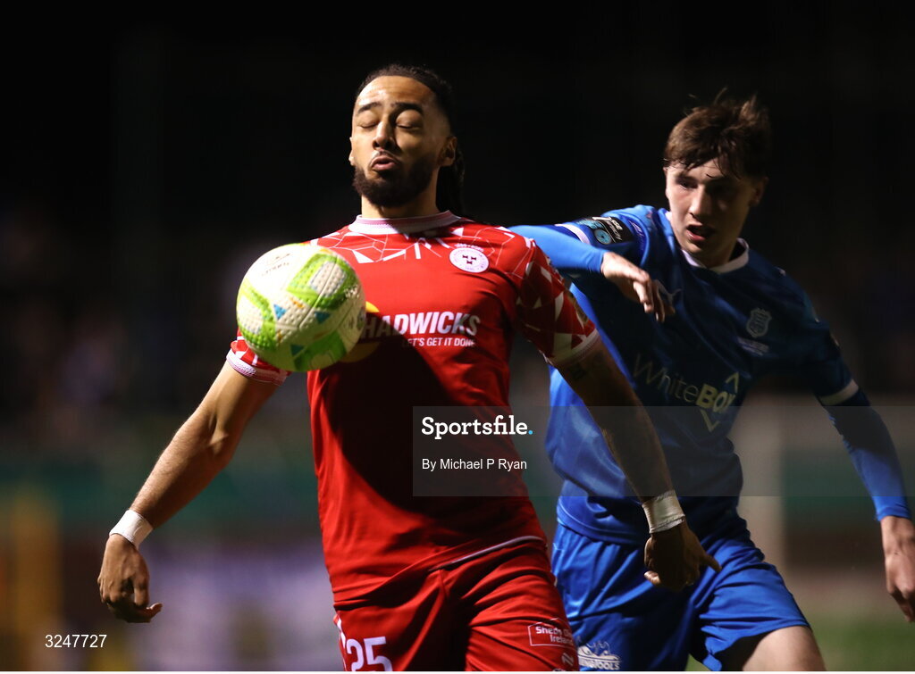 26 September 2025; Milan Mbeng of Shelbourne in action against Josh Miles of Waterford during the SSE Airtricity Men's Premier Division match between Shelbourne and Waterford at Tolka Park in Dublin. Photo by Michael P Ryan/Sportsfile