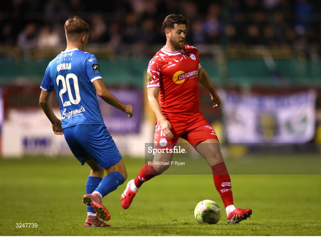 26 September 2025; Sam Bone of Shelbourne in action against Conan Noonan of Waterford during the SSE Airtricity Men's Premier Division match between Shelbourne and Waterford at Tolka Park in Dublin. Photo by Michael P Ryan/Sportsfile