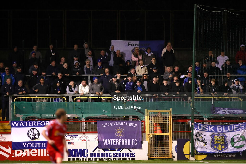 26 September 2025; Waterford supporters during the SSE Airtricity Men's Premier Division match between Shelbourne and Waterford at Tolka Park in Dublin. Photo by Michael P Ryan/Sportsfile