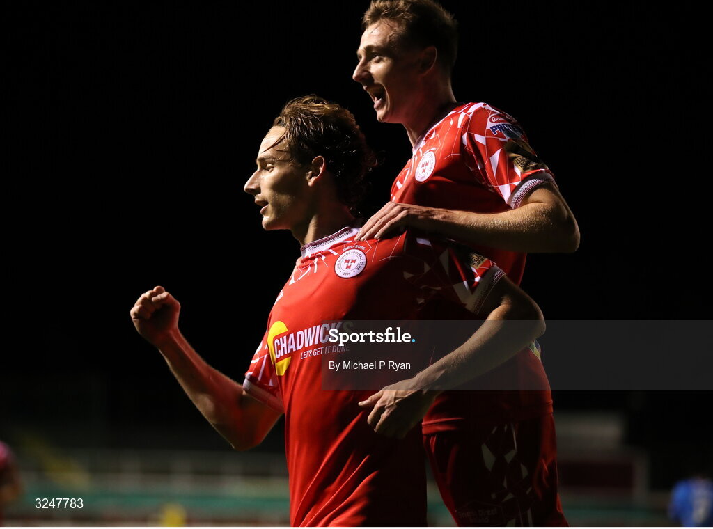 26 September 2025; Harry Wood of Shelbourne, left, celebrates after scoring his side's second goal, a penalty, with teammate Daniel Kelly during the SSE Airtricity Men's Premier Division match between Shelbourne and Waterford at Tolka Park in Dublin. Photo by Michael P Ryan/Sportsfile