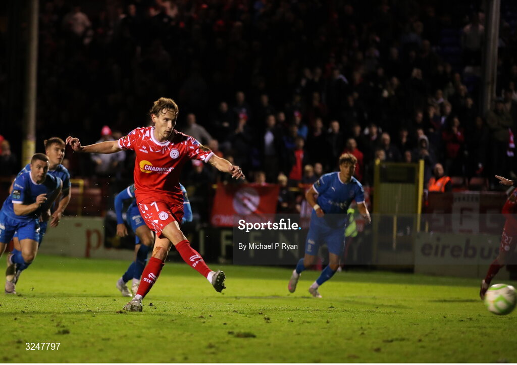 26 September 2025; Harry Wood of Shelbourne scores his side's second goal, a penalty during the SSE Airtricity Men's Premier Division match between Shelbourne and Waterford at Tolka Park in Dublin. Photo by Michael P Ryan/Sportsfile