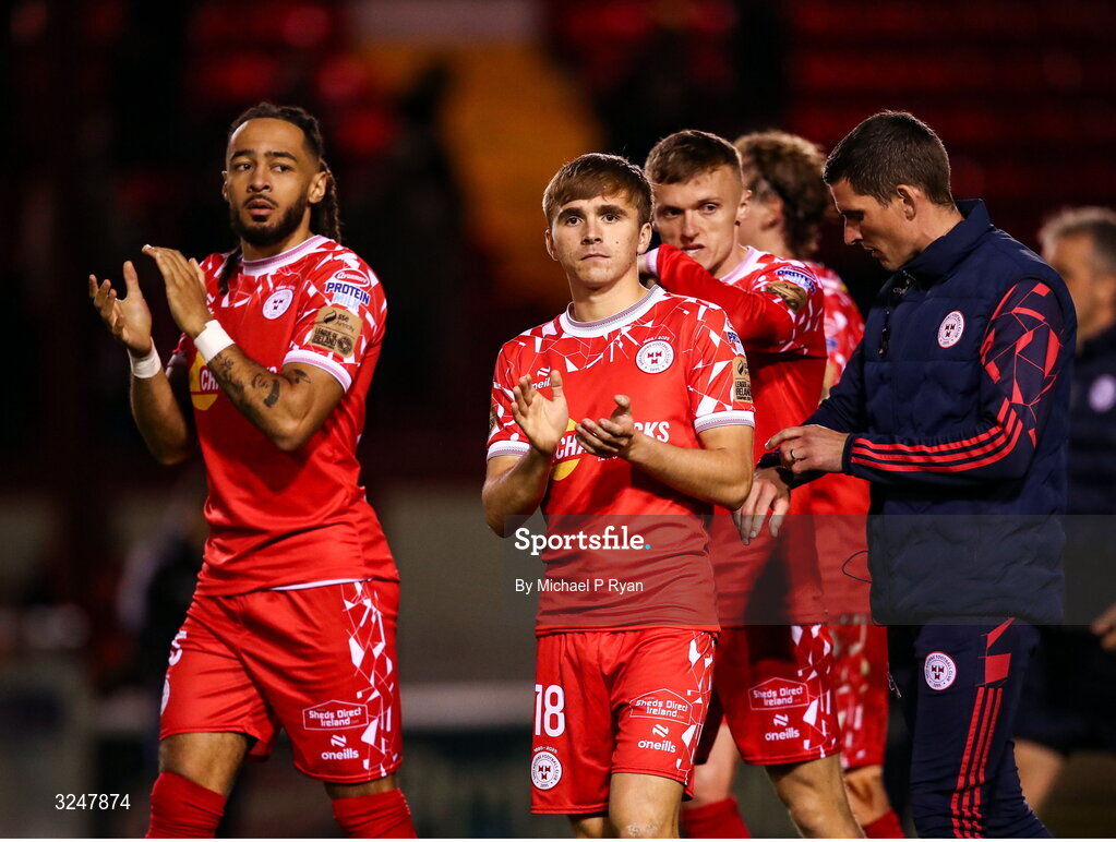 26 September 2025; Shelbourne players, from left, Milan Mbeng and James Norris after their side's victory in the SSE Airtricity Men's Premier Division match between Shelbourne and Waterford at Tolka Park in Dublin. Photo by Michael P Ryan/Sportsfile