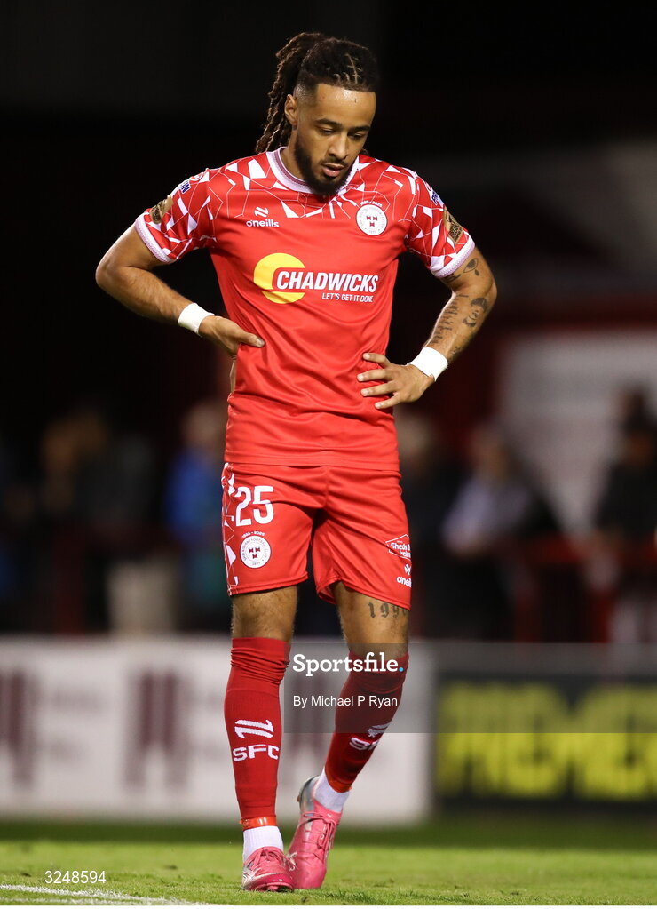 26 September 2025; Milan Mbeng of Shelbourne during the SSE Airtricity Men's Premier Division match between Shelbourne and Waterford at Tolka Park in Dublin. Photo by Michael P Ryan/Sportsfile