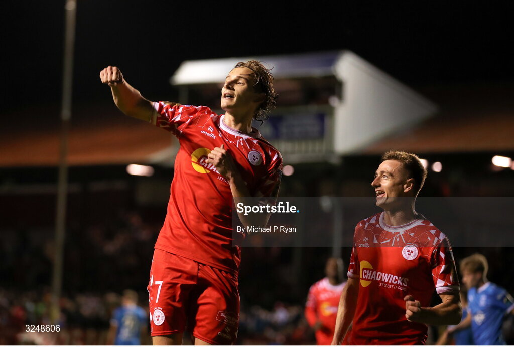 26 September 2025; Harry Wood of Shelbourne celebrates after scoring his side's second goal, a penalty, during the SSE Airtricity Men's Premier Division match between Shelbourne and Waterford at Tolka Park in Dublin. Photo by Michael P Ryan/Sportsfile
