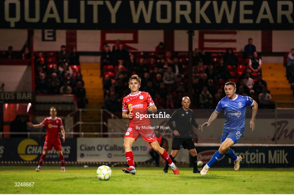 26 September 2025; James Norris of Shelbourne in action against Jordan Rossiter of Waterford during the SSE Airtricity Men's Premier Division match between Shelbourne and Waterford at Tolka Park in Dublin. Photo by Michael P Ryan/Sportsfile