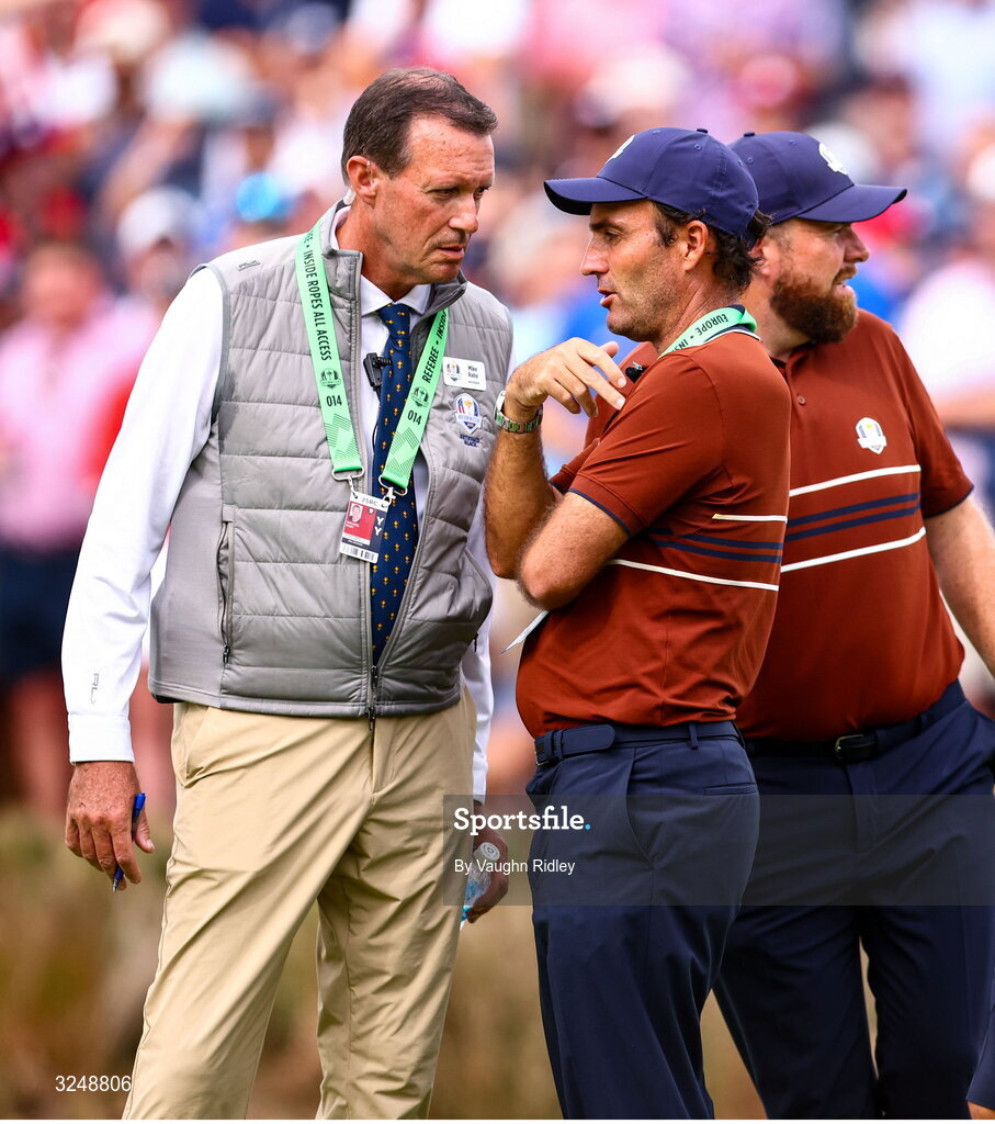 27 September 2025; Europe vice-captain Francesco Molinari speaks with an official as supporters heckle at the sixth hole during the afternoon fourballs on day two of the 2025 Ryder Cup at Black Course at Bethpage State Park Golf Course in Farmingdale, New York, USA. Photo by Vaughn Ridley/Sportsfile