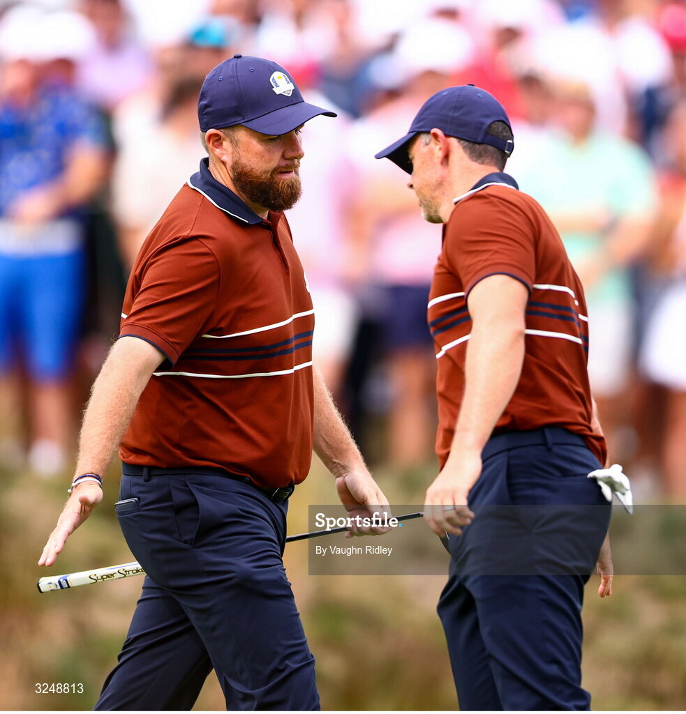 27 September 2025; Shane Lowry of Europe, left, celebrates with Rory McIlroy of Europe after putting on the sixth green during the afternoon fourballs on day two of the 2025 Ryder Cup at Black Course at Bethpage State Park Golf Course in Farmingdale, New York, USA. Photo by Vaughn Ridley/Sportsfile