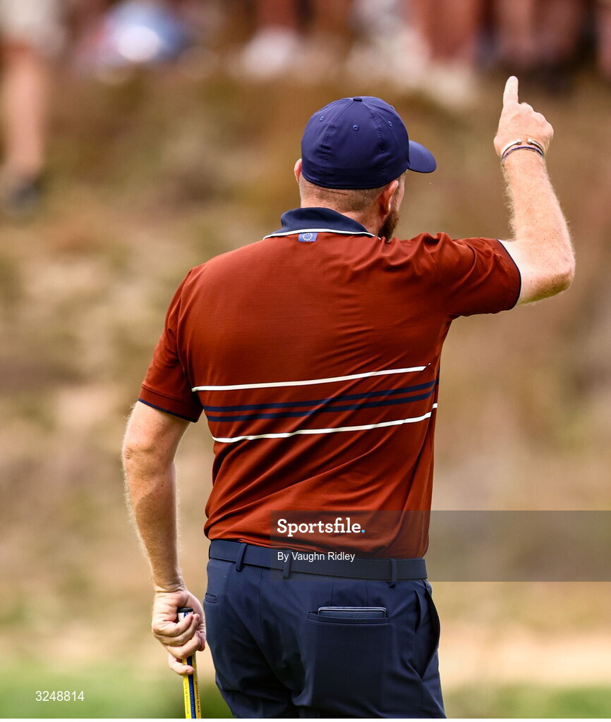 27 September 2025; Shane Lowry of Europe gestures to USA supporters after putting on the sixth green during the afternoon fourballs on day two of the 2025 Ryder Cup at Black Course at Bethpage State Park Golf Course in Farmingdale, New York, USA. Photo by Vaughn Ridley/Sportsfile