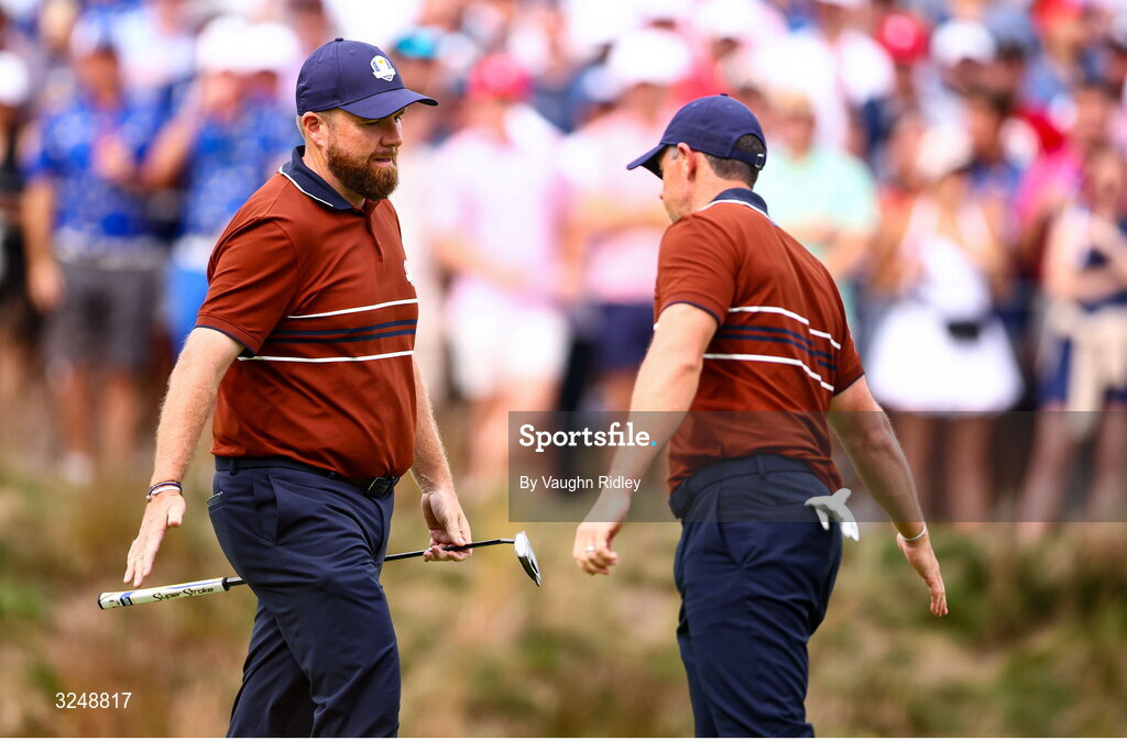 27 September 2025; Shane Lowry of Europe, left, celebrates with Rory McIlroy of Europe after putting on the sixth green during the afternoon fourballs on day two of the 2025 Ryder Cup at Black Course at Bethpage State Park Golf Course in Farmingdale, New York, USA. Photo by Vaughn Ridley/Sportsfile