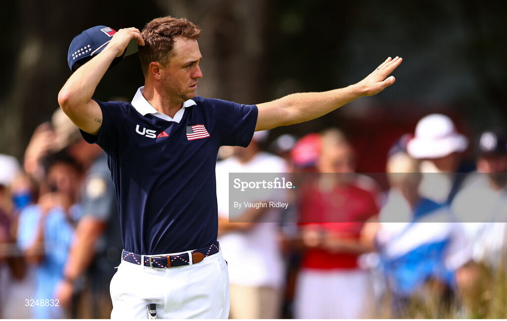 27 September 2025; Justin Thomas of USA gestures to USA fans during the afternoon fourballs on day two of the 2025 Ryder Cup at Black Course at Bethpage State Park Golf Course in Farmingdale, New York, USA. Photo by Vaughn Ridley/Sportsfile