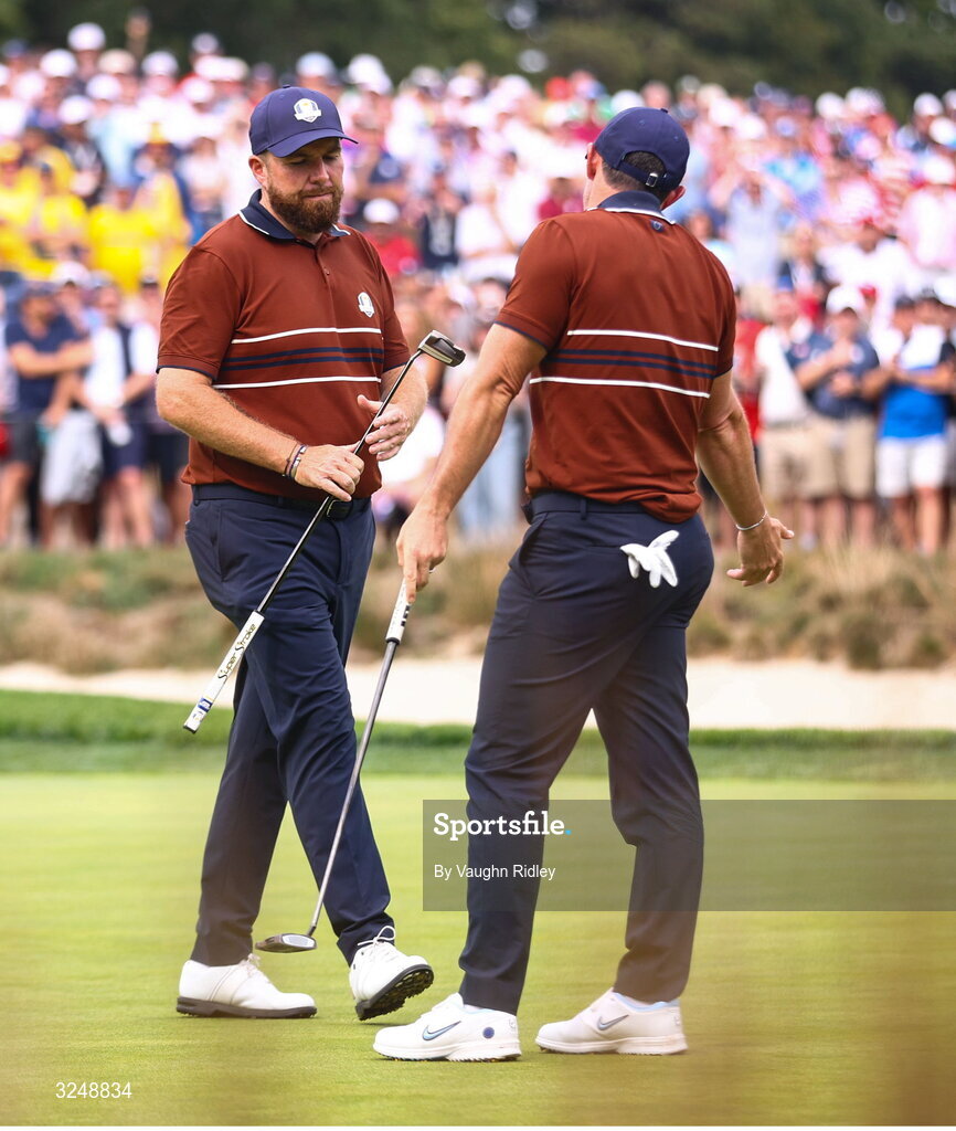 27 September 2025; Rory McIlroy of Europe, right, and Shane Lowry of Europe react after stopping play due to crowd taunts during the afternoon fourballs on day two of the 2025 Ryder Cup at Black Course at Bethpage State Park Golf Course in Farmingdale, New York, USA. Photo by Vaughn Ridley/Sportsfile