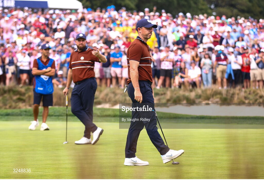 27 September 2025; Rory McIlroy of Europe, right, and Shane Lowry of Europe react after stopping play due to crowd taunts during the afternoon fourballs on day two of the 2025 Ryder Cup at Black Course at Bethpage State Park Golf Course in Farmingdale, New York, USA. Photo by Vaughn Ridley/Sportsfile