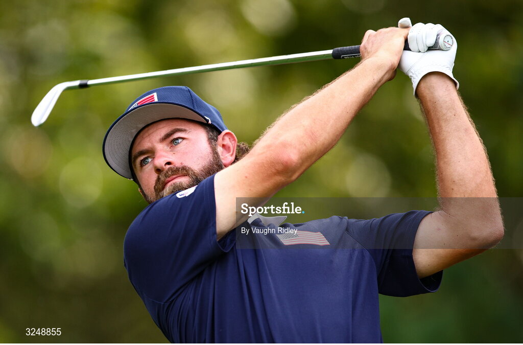 27 September 2025; Cameron Young of USA watches his tee shot on the eighth hole during the afternoon fourballs on day two of the 2025 Ryder Cup at Black Course at Bethpage State Park Golf Course in Farmingdale, New York, USA. Photo by Vaughn Ridley/Sportsfile