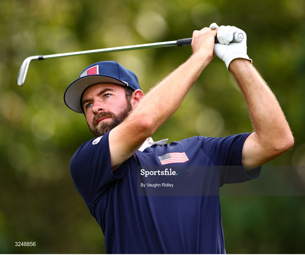 27 September 2025; Cameron Young of USA watches his tee shot on the eighth hole during the afternoon fourballs on day two of the 2025 Ryder Cup at Black Course at Bethpage State Park Golf Course in Farmingdale, New York, USA. Photo by Vaughn Ridley/Sportsfile