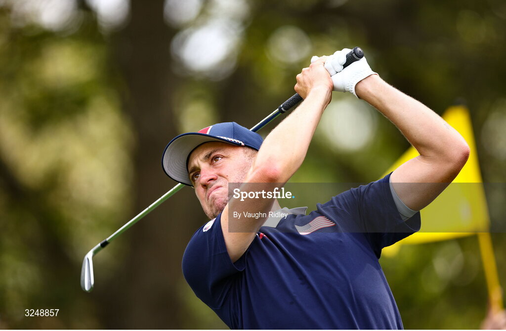 27 September 2025; Justin Thomas of USA watches his tee shot on the eighth hole during the afternoon fourballs on day two of the 2025 Ryder Cup at Black Course at Bethpage State Park Golf Course in Farmingdale, New York, USA. Photo by Vaughn Ridley/Sportsfile