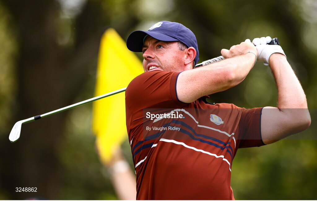 27 September 2025; Rory McIlroy of Europe watches his tee shot on the eighth hole during the afternoon fourballs on day two of the 2025 Ryder Cup at Black Course at Bethpage State Park Golf Course in Farmingdale, New York, USA. Photo by Vaughn Ridley/Sportsfile