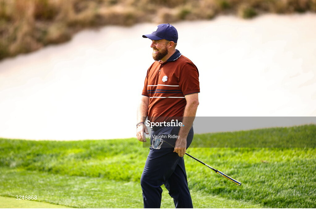 27 September 2025; Shane Lowry of Europe reacts after missing a putt on the eighth green during the afternoon fourballs on day two of the 2025 Ryder Cup at Black Course at Bethpage State Park Golf Course in Farmingdale, New York, USA. Photo by Vaughn Ridley/Sportsfile