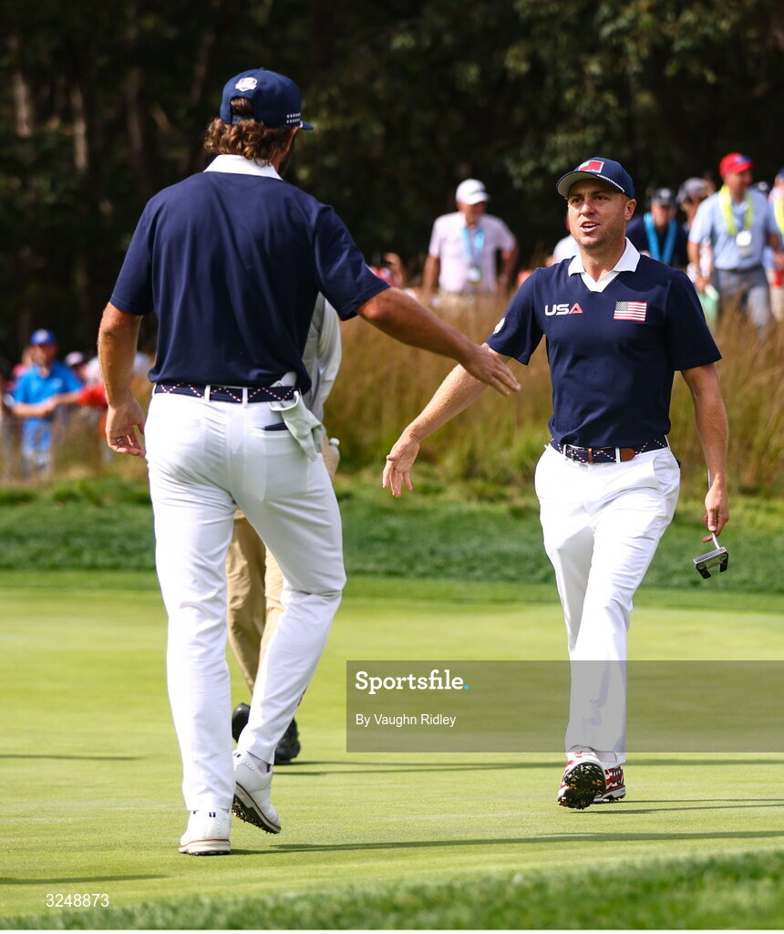 27 September 2025; Justin Thomas of USA, right, and Cameron Young of USA during the afternoon fourballs on day two of the 2025 Ryder Cup at Black Course at Bethpage State Park Golf Course in Farmingdale, New York, USA. Photo by Vaughn Ridley/Sportsfile