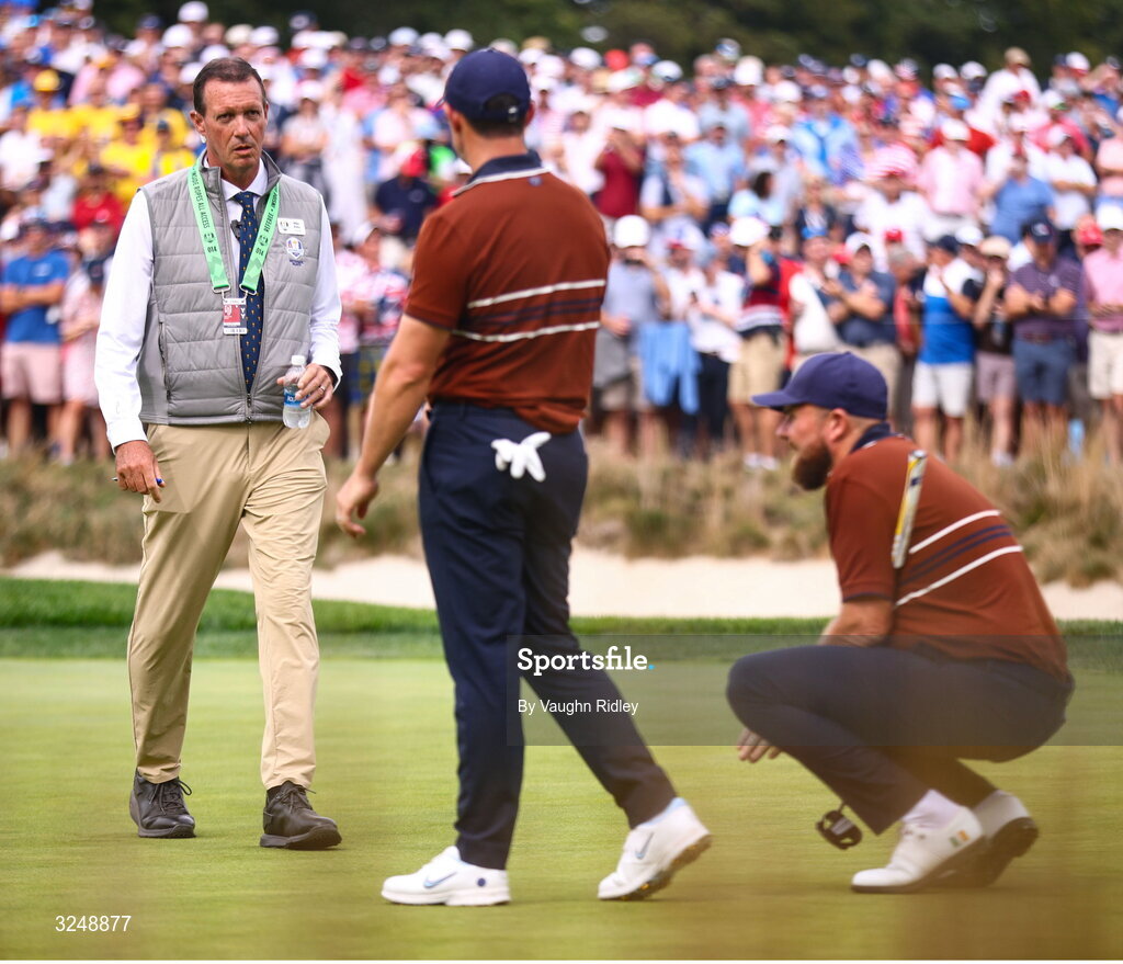 27 September 2025; An official enters the green as play is stopped due to crowd noise and taunts during the afternoon fourballs on day two of the 2025 Ryder Cup at Black Course at Bethpage State Park Golf Course in Farmingdale, New York, USA. Photo by Vaughn Ridley/Sportsfile