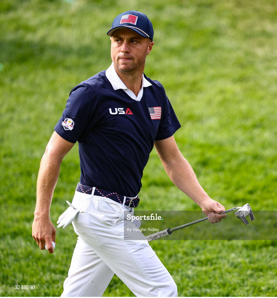 27 September 2025; Justin Thomas of USA celebrates after putting on the eighth green during the afternoon fourballs on day two of the 2025 Ryder Cup at Black Course at Bethpage State Park Golf Course in Farmingdale, New York, USA. Photo by Vaughn Ridley/Sportsfile