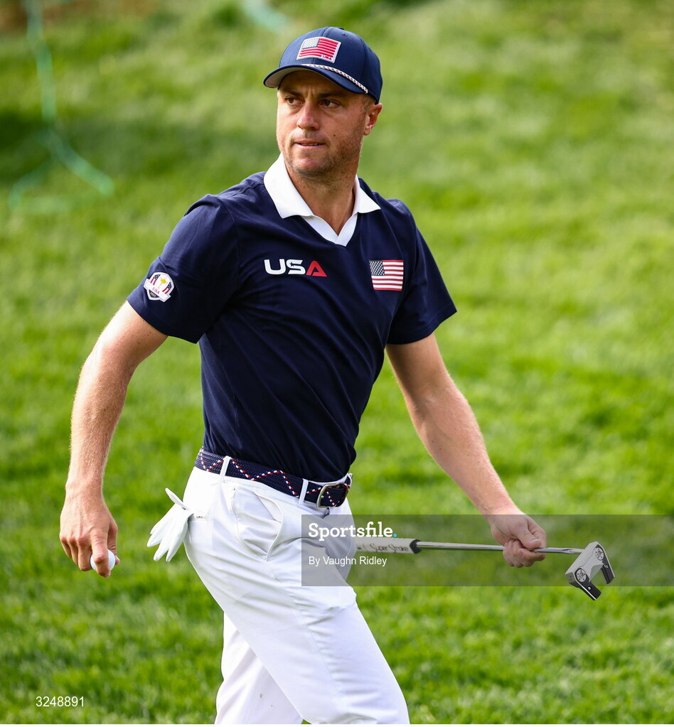 27 September 2025; Justin Thomas of USA celebrates after putting on the eighth green during the afternoon fourballs on day two of the 2025 Ryder Cup at Black Course at Bethpage State Park Golf Course in Farmingdale, New York, USA. Photo by Vaughn Ridley/Sportsfile